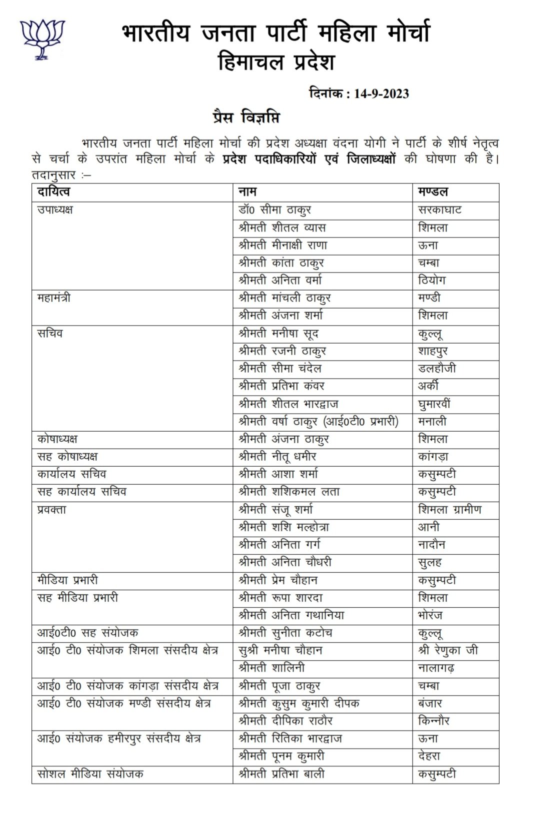 महामंत्री मांचली ठाकुर और अंजना शर्मा होंगी।प्रदेश सचिव मनीषा सूद, रजनी ठाकुर, सीमा चंदेल, प्रतिभा कंवर, शीतल भारद्वाज और वर्षा ठाकुर (आई०टी० प्रभारी) नियुक्त किए गए।
