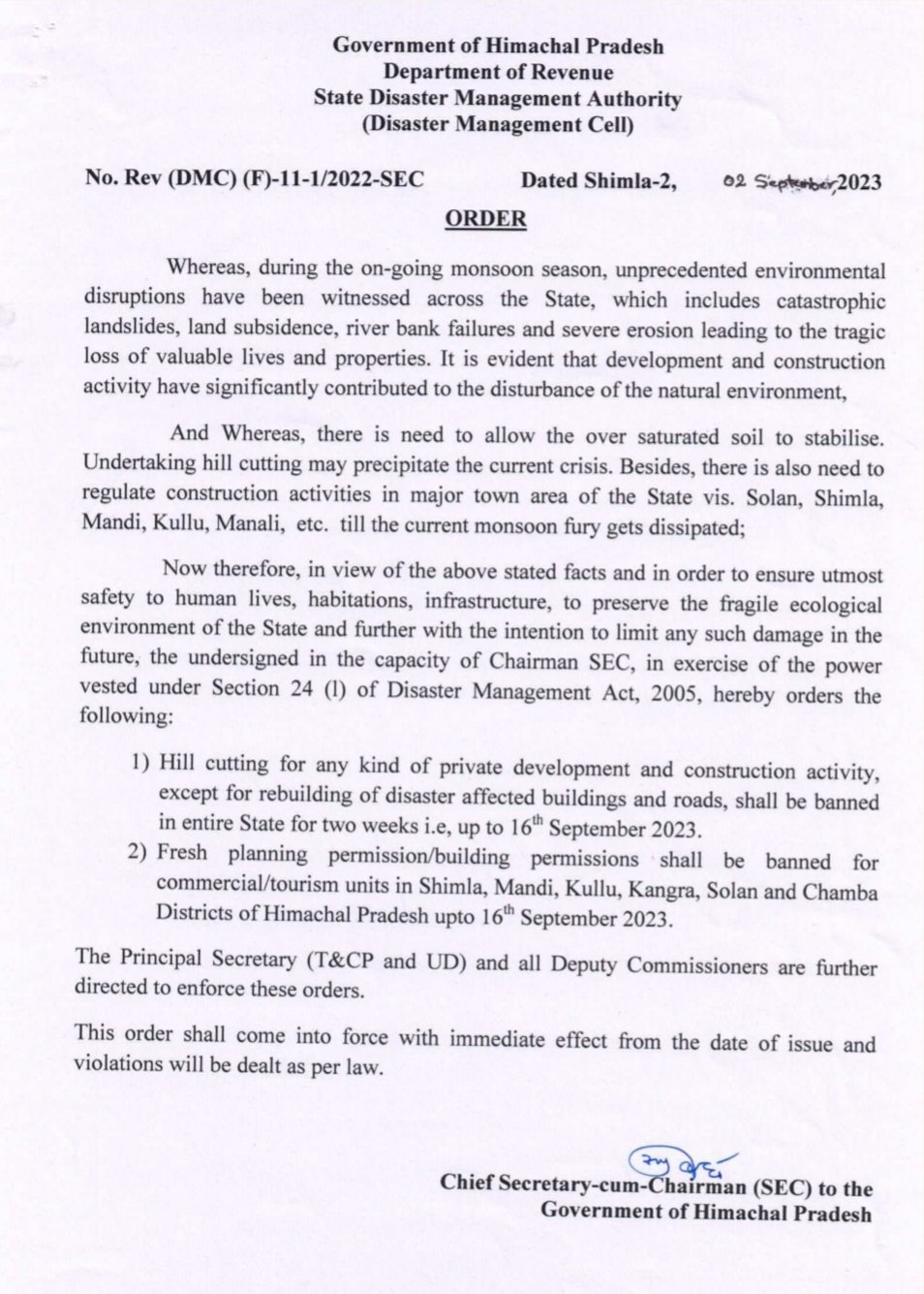 हिमाचल में 16 सितंबर तक निज़ी विकास एवम निर्माण के साथ 6 जिलों में भवन निर्माण की अनुमति पर भी प्रतिबंध.