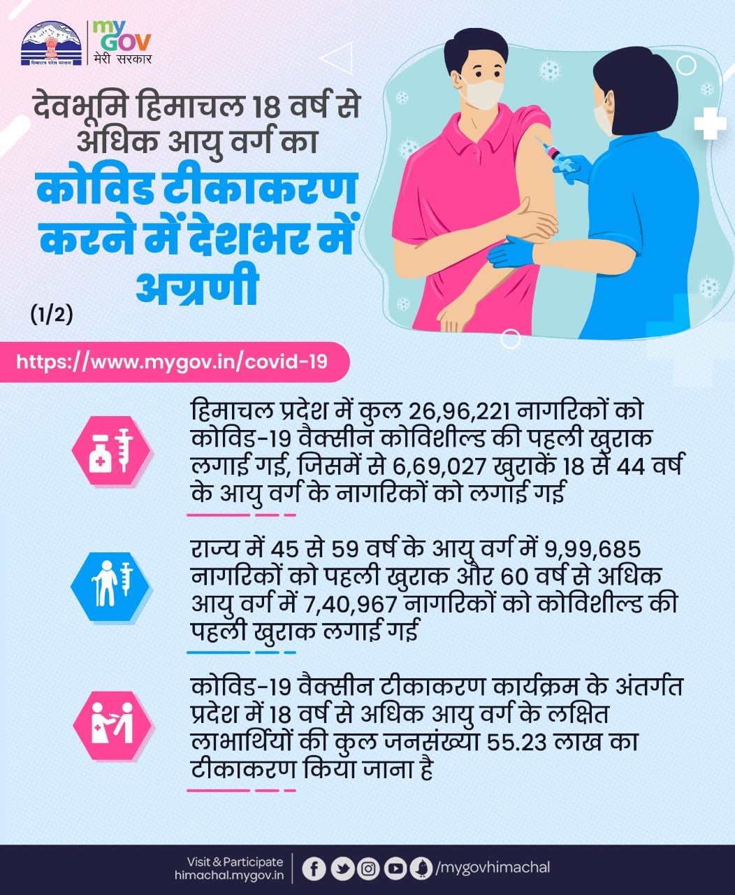‘‘कोरोना को हराएंगे, कोविड वैक्सीन जरूर लगाएंगे’’हिमाचल प्रदेश में कोविड-19 टीकाकरण अभियान सफलता की ओर बढ़ रहा है। हिमाचल प्रदेश 18 वर्ष से अधिक आयु वर्ग का सबसे अधिक टीकाकरण करने वाले देश के 22 राज्यों में अग्रणी स्थान पर आंका जा रहा है। कोविड-19 से संबंधित जानकारी के लिएRead More →