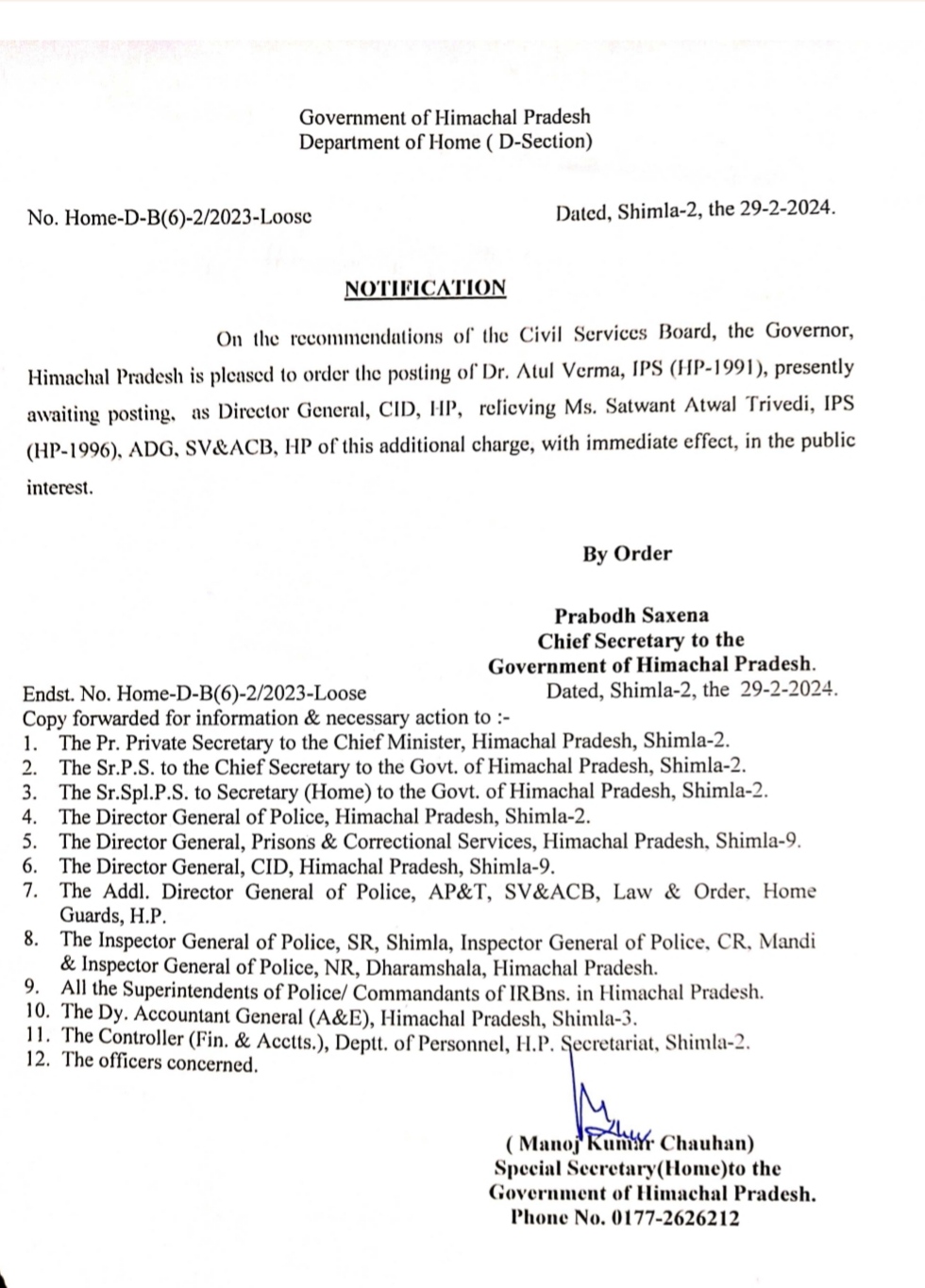 शिमला:- Dr अतुल वर्मा को DG, CID लगाया, सतवंत अटवाल को हटाया, राज्यसभा में क्रॉस वोटिंग एपिसोड को लेकर intelligence पर उठ रहे थे सवाल.