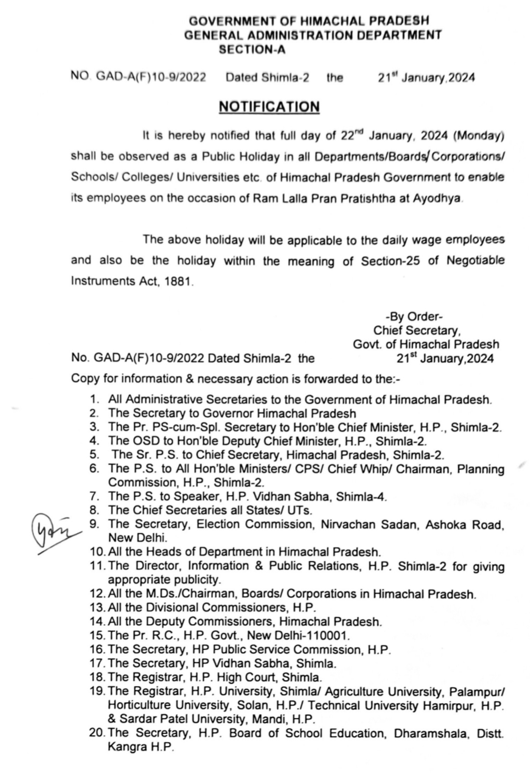 हिमाचल में 22 जनवरी को रहेगी छुट्टी, अयोध्या में राम लला की प्राण प्रतिष्ठा पर के दिन छुट्टी का एलान… देखें notification🔔