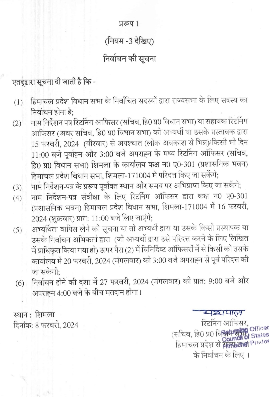 हिमाचल में राज्यसभा की एक सीट के लिए 27 फरवरी को होगा मतदान….
