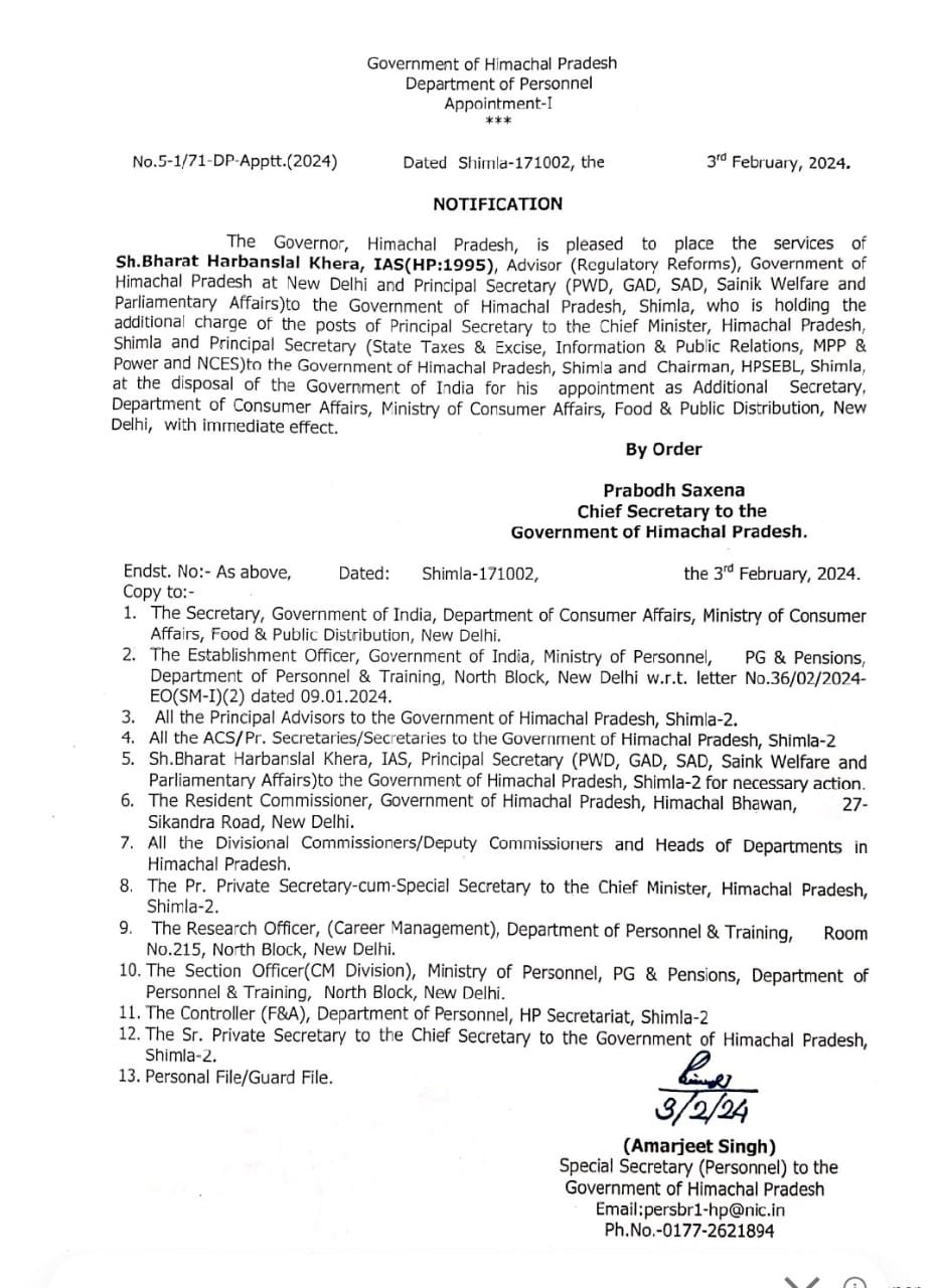 IAS भरत खेड़ा जायेंगे दिल्ली, कौन होगा मुख्यमंत्री का प्रधान सचिव? अधिसूचना देखें.