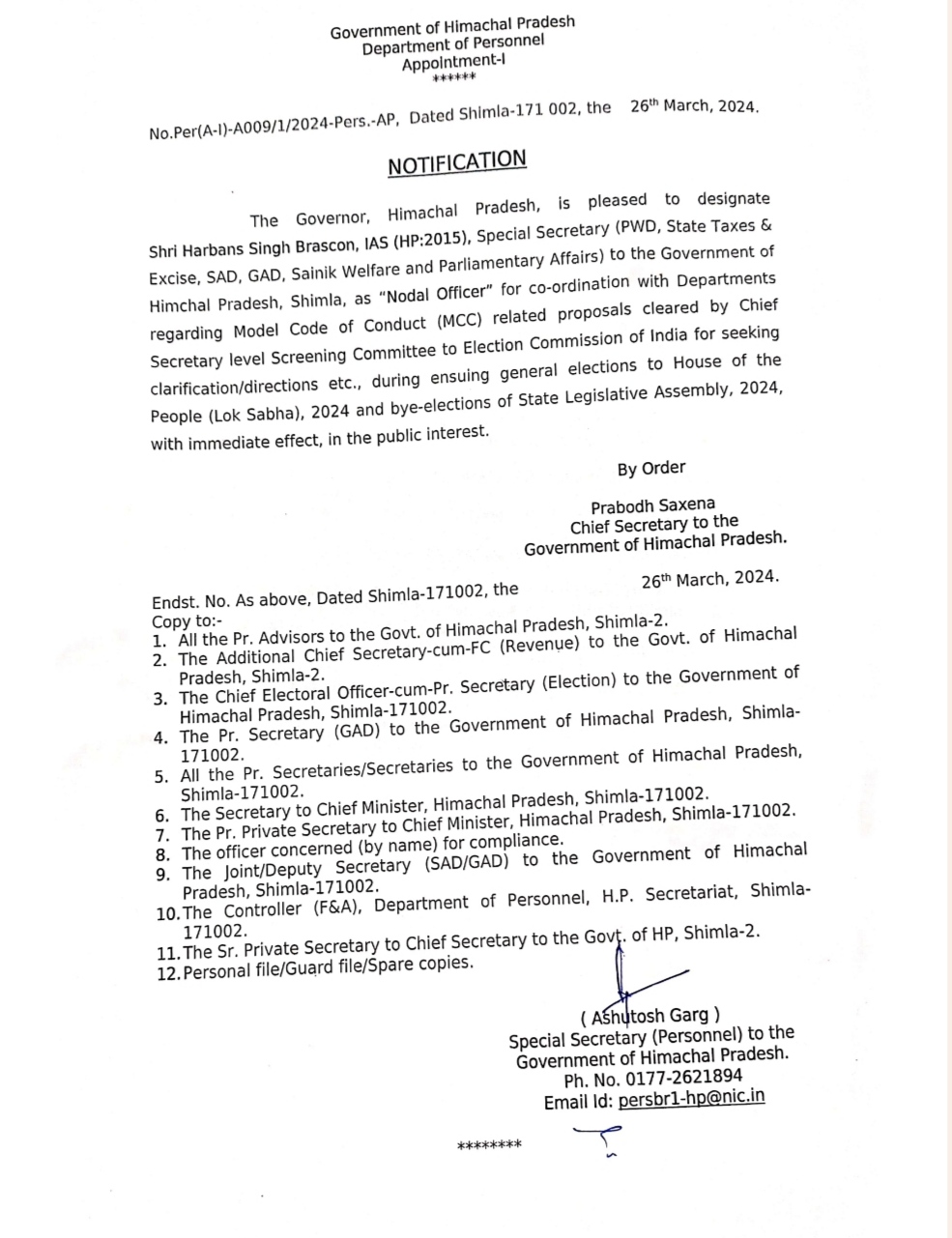 IAS हरबंस सिंह बरस्कान को बनाया MCC का नोडल ऑफिसर.