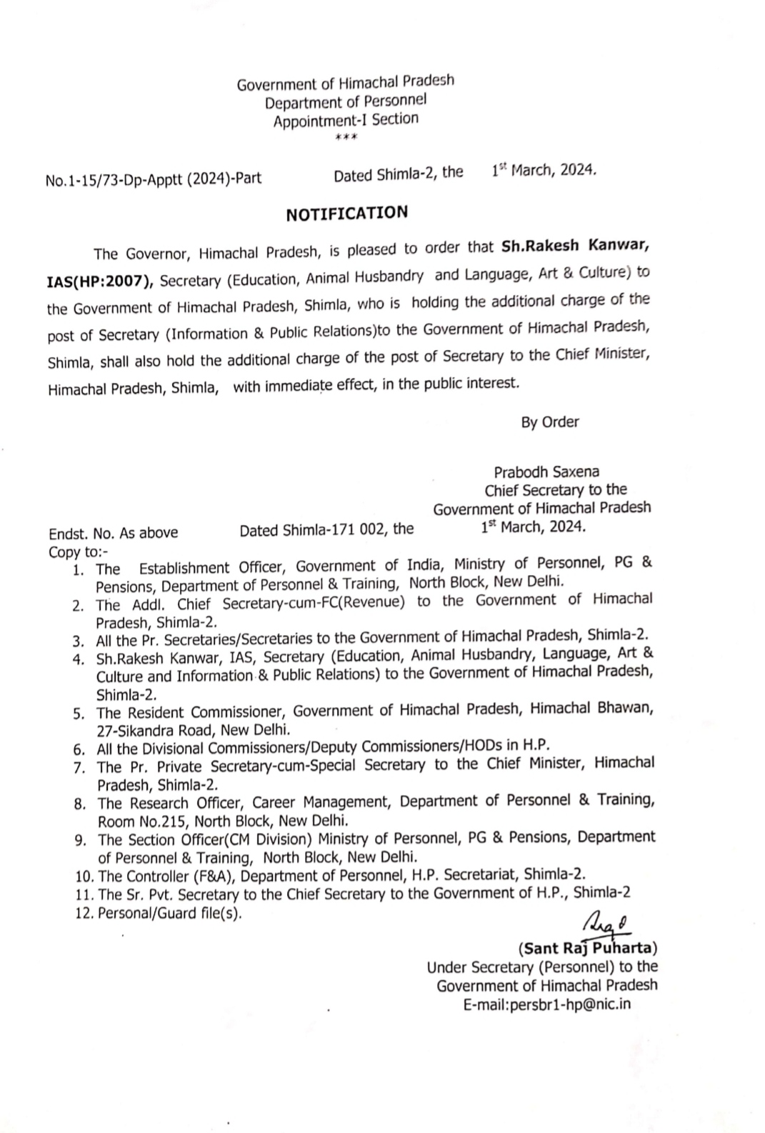 IAS राकेश कंवर होंगे भरत खेड़ा की जगह CM सुक्खू के सचिव.