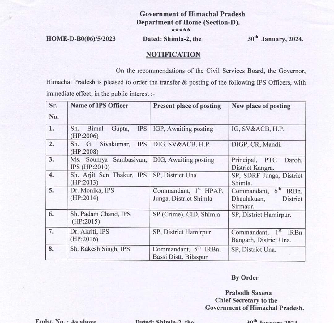सरकार ने बड़े पैमाने पर बदले IPS और HPPS अफसर, हमीरपुर और ऊना के एसपी भी बदले.