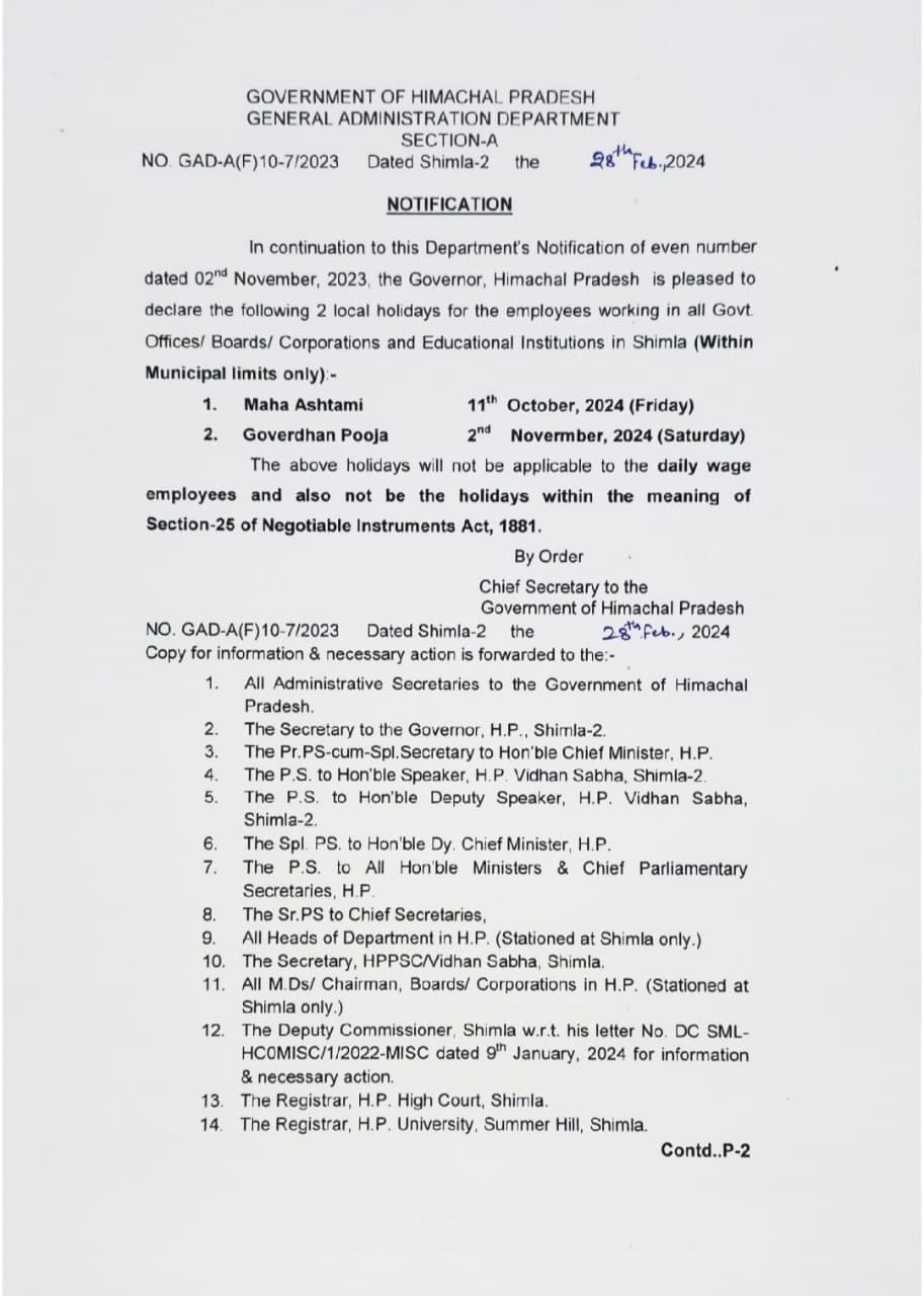 शिमला में रहेंगी 11 अक्तूबर और 2 नवंबर को दो लोकल छुट्टियां..