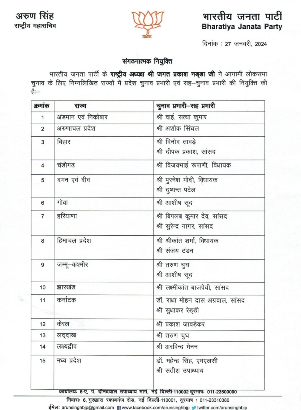 लोक सभा चुनावों के लिए भाजपा ने जारी की प्रभारियों व सह प्रभारियों की सूची.