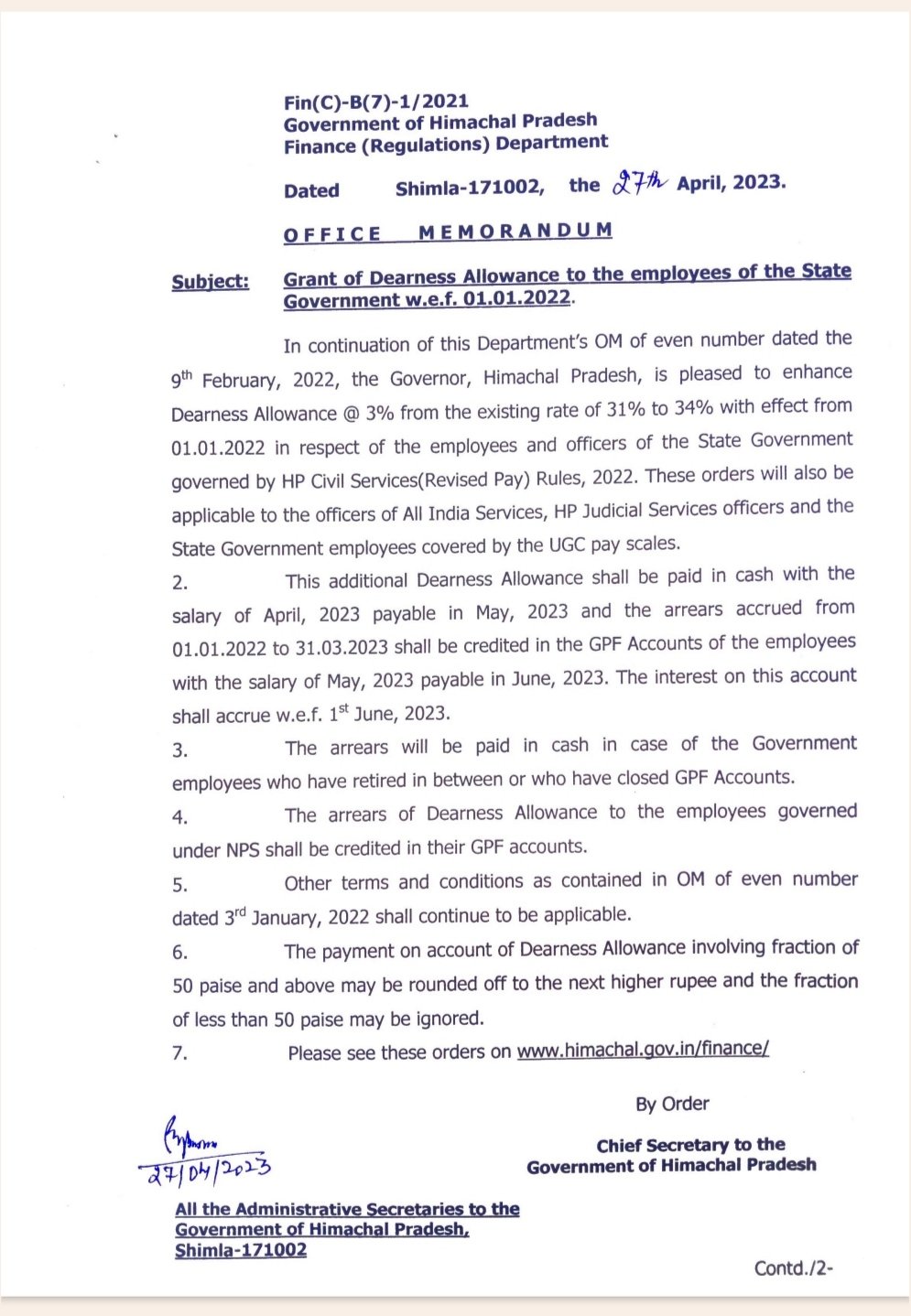 हिमाचल के कर्मचारियों के लिए DA की तीन फ़ीसदी की अधिसूचना जारी.