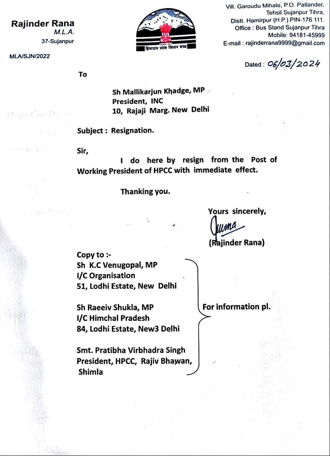राजेंद्र राणा ने हिमाचल कार्यकारी अध्यक्ष से दिया इस्तीफा…