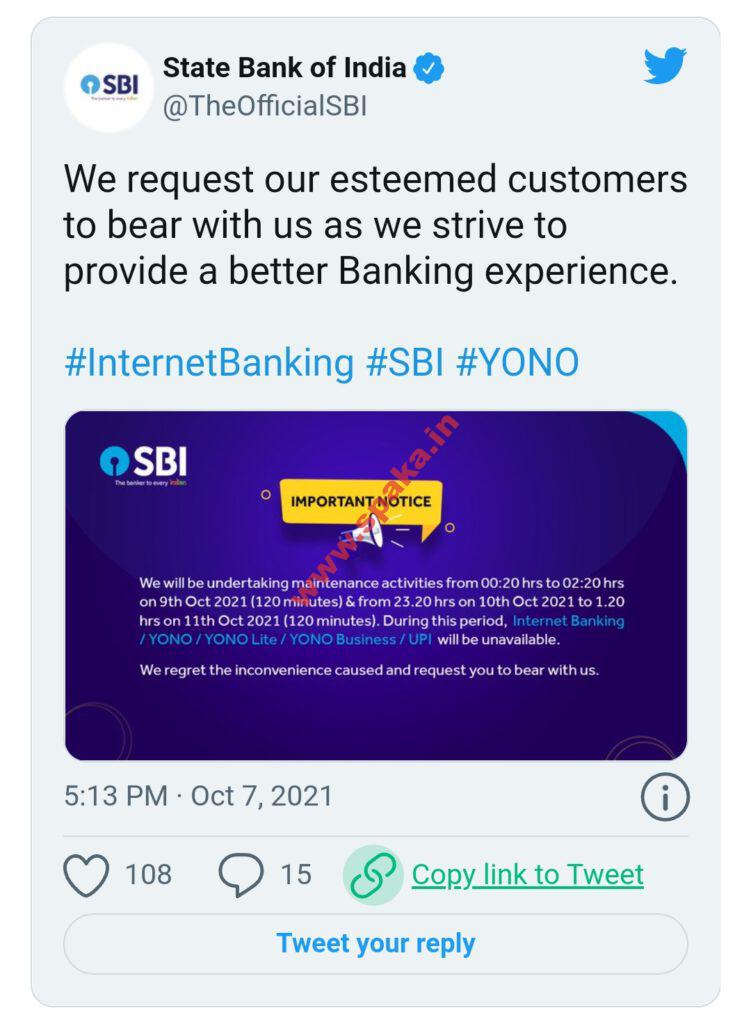 एसबीआई ने ट्वीट के माध्यम से कहा कि ये सेवाएं 09 अक्टूबर की रात 12:20 से 02:20 तक बंद रहेंगी। 10 और 11 अक्टूबर को रात 11:20 से लेकर 1:20 तक ये सेवाएं उपलब्ध नहीं होंगी।