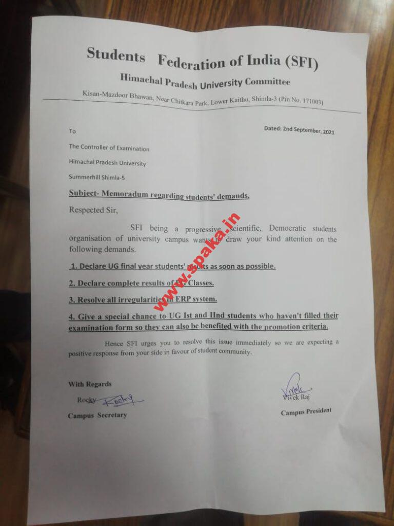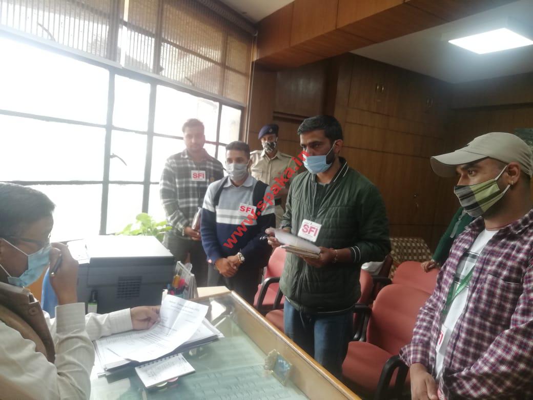 आज एसएफआई हिमाचल प्रदेश विश्वविद्यालय इकाई द्वारा विश्विद्यालय परीक्षा नियंत्रक को ईआरपी सिस्टम की खामियों को दुरुस्त करने व UG/PG के रिजल्ट जल्द निकालने की मांग को लेकर ज्ञापन पत्र सौंपा।