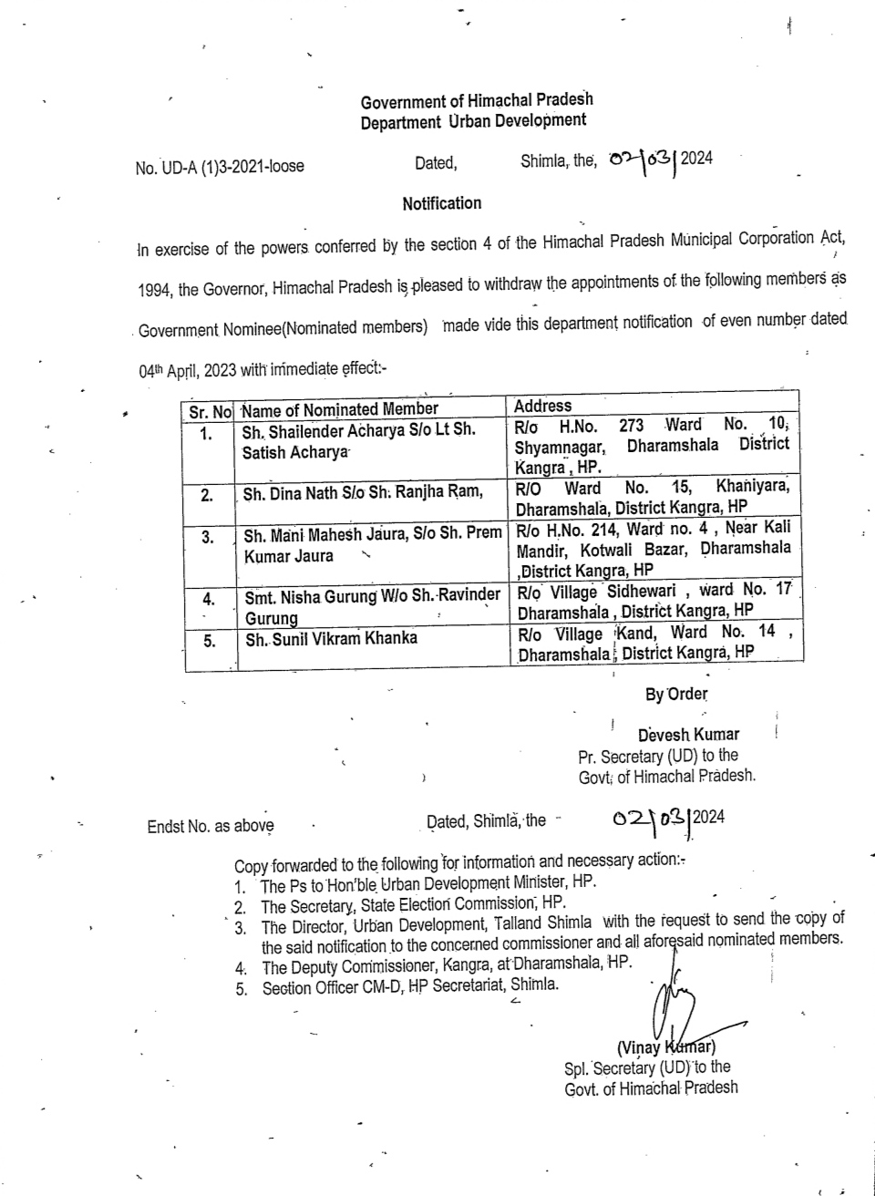 सुधीर शर्मा के समर्थक धर्मशाला नगर निगम के मनोनीत पार्षदों की नियुक्तियां की रद्द.