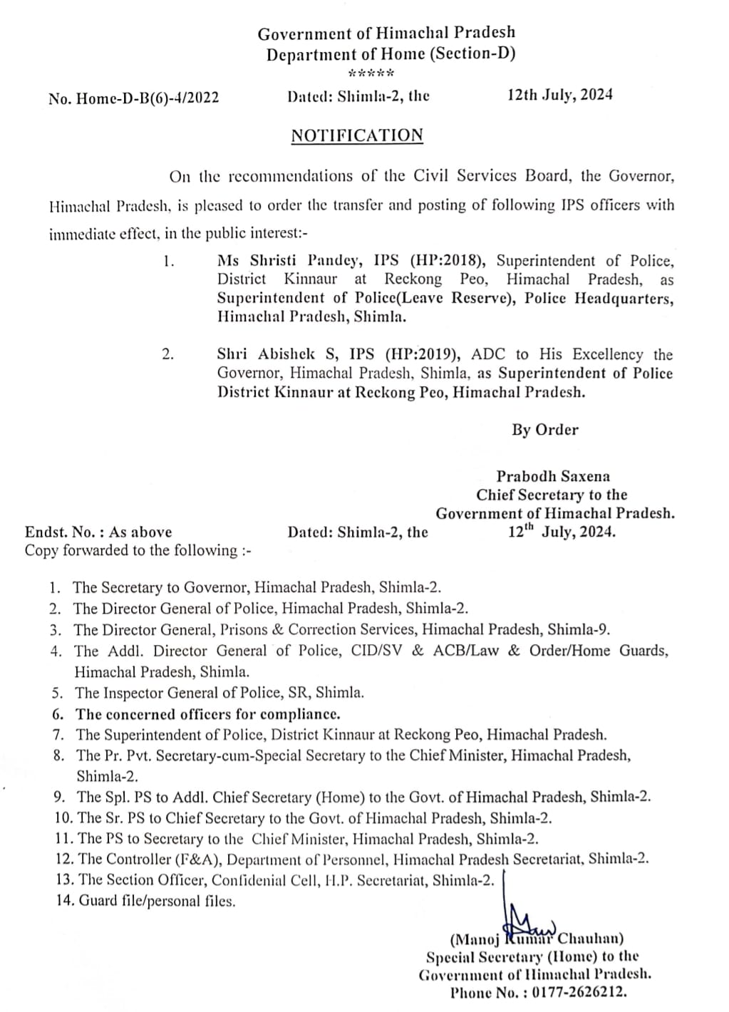सरकार ने किए IPS के तबादले, किन्नौर SP बदले….